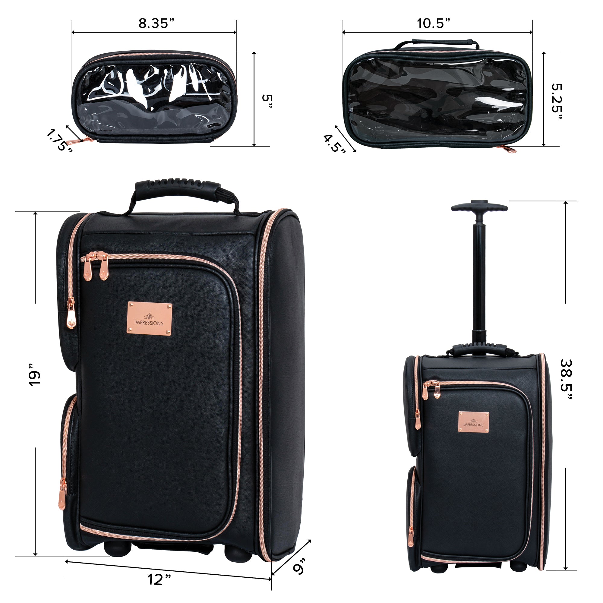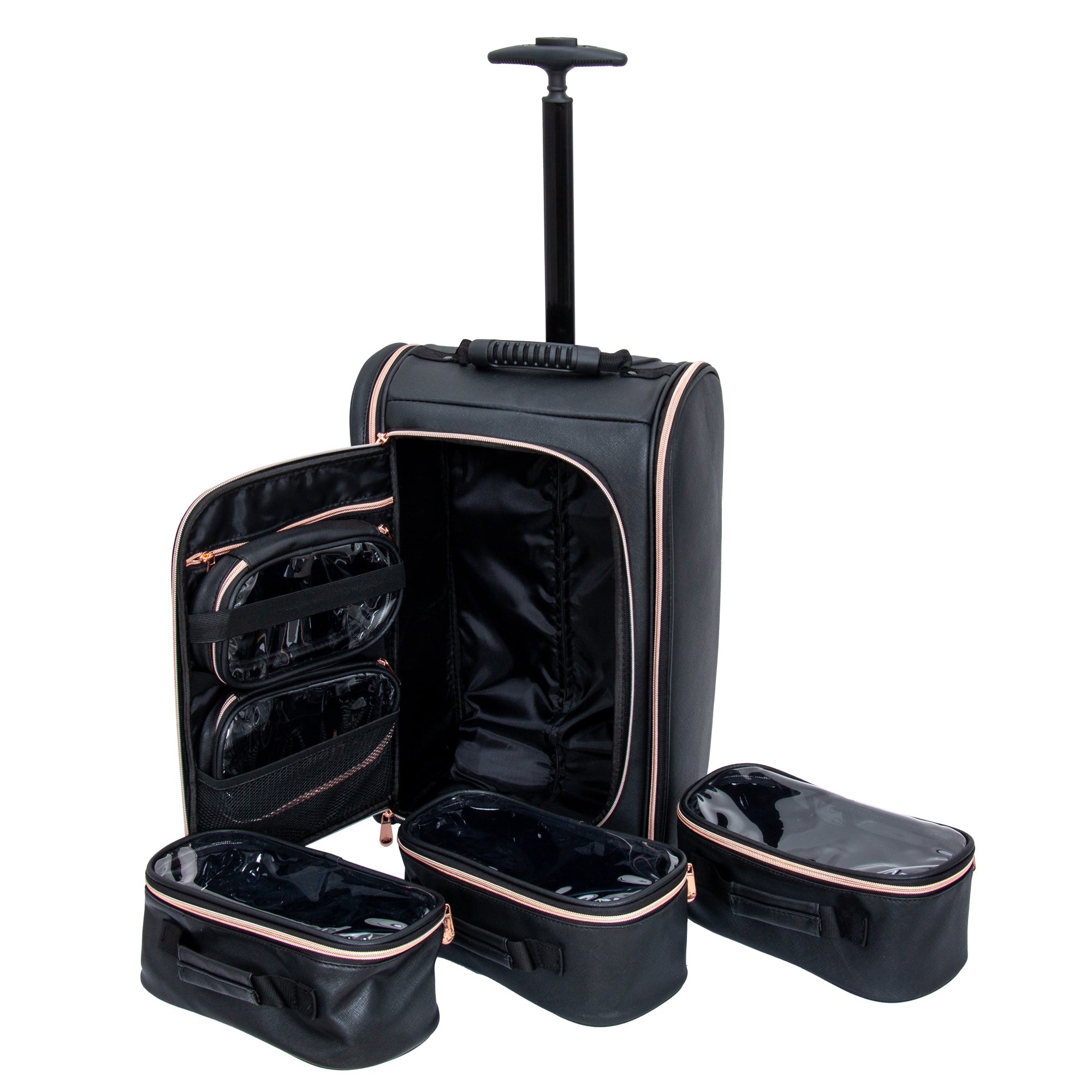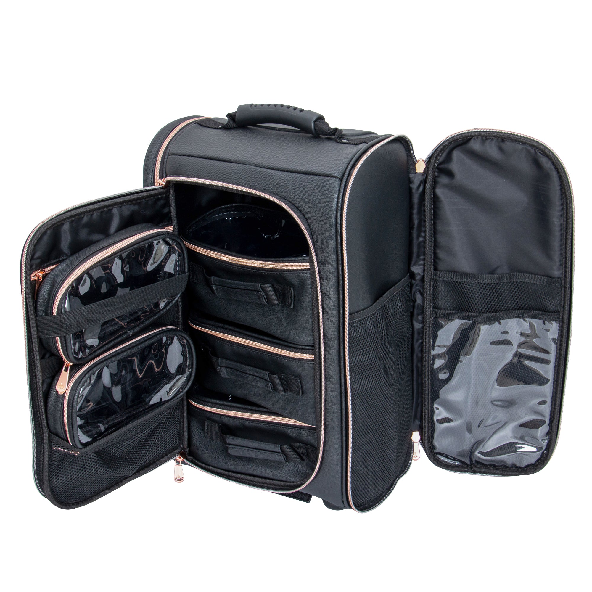 Get ready for the ultimate travel companion that keeps all your Slayssentials with you. Designed with plenty of pockets and 5 removable pouches, this case will keep all your necessities organized. The CONVERTIBLE Travel Organizer Makeup Case converts from a rolling case to a backpack for multi-functional use and features a high quality faux leather exterior and contrast rose gold trim.