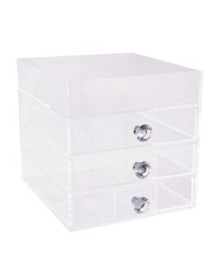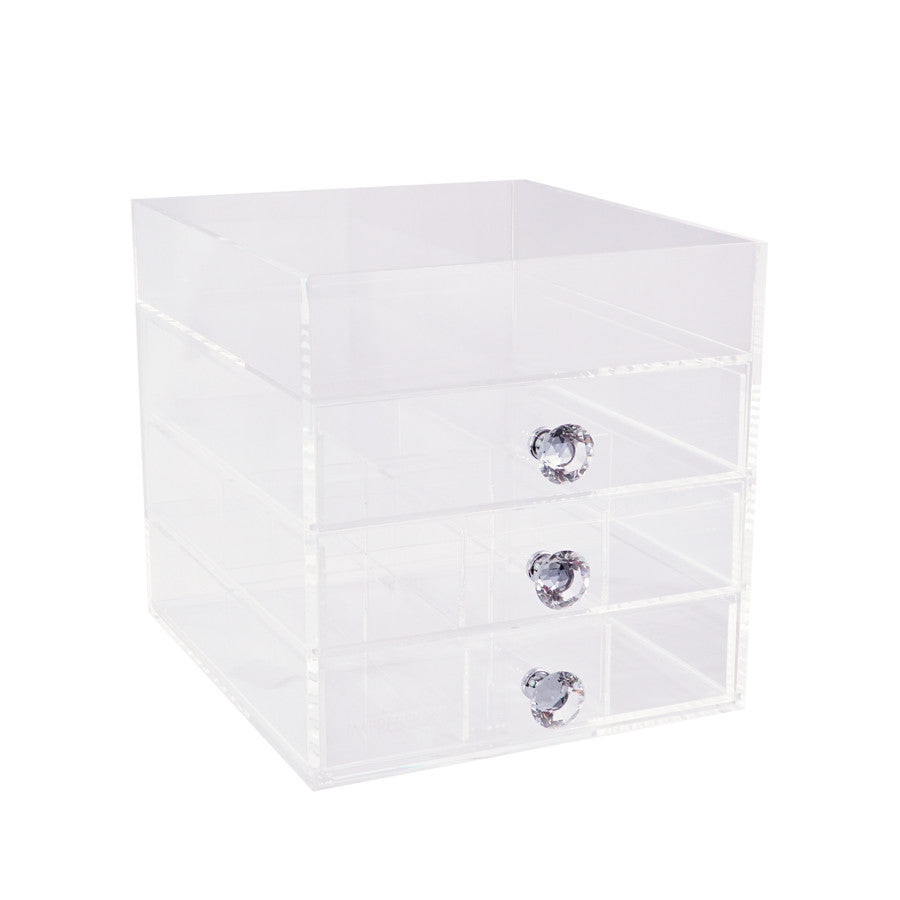Three tiers of crystal bling give way to effortlessly glamorous storage space. Two out of three of the drawers include dividers to make organizing that much more simple and flexible and it’s open top means you can pile high without a worry!