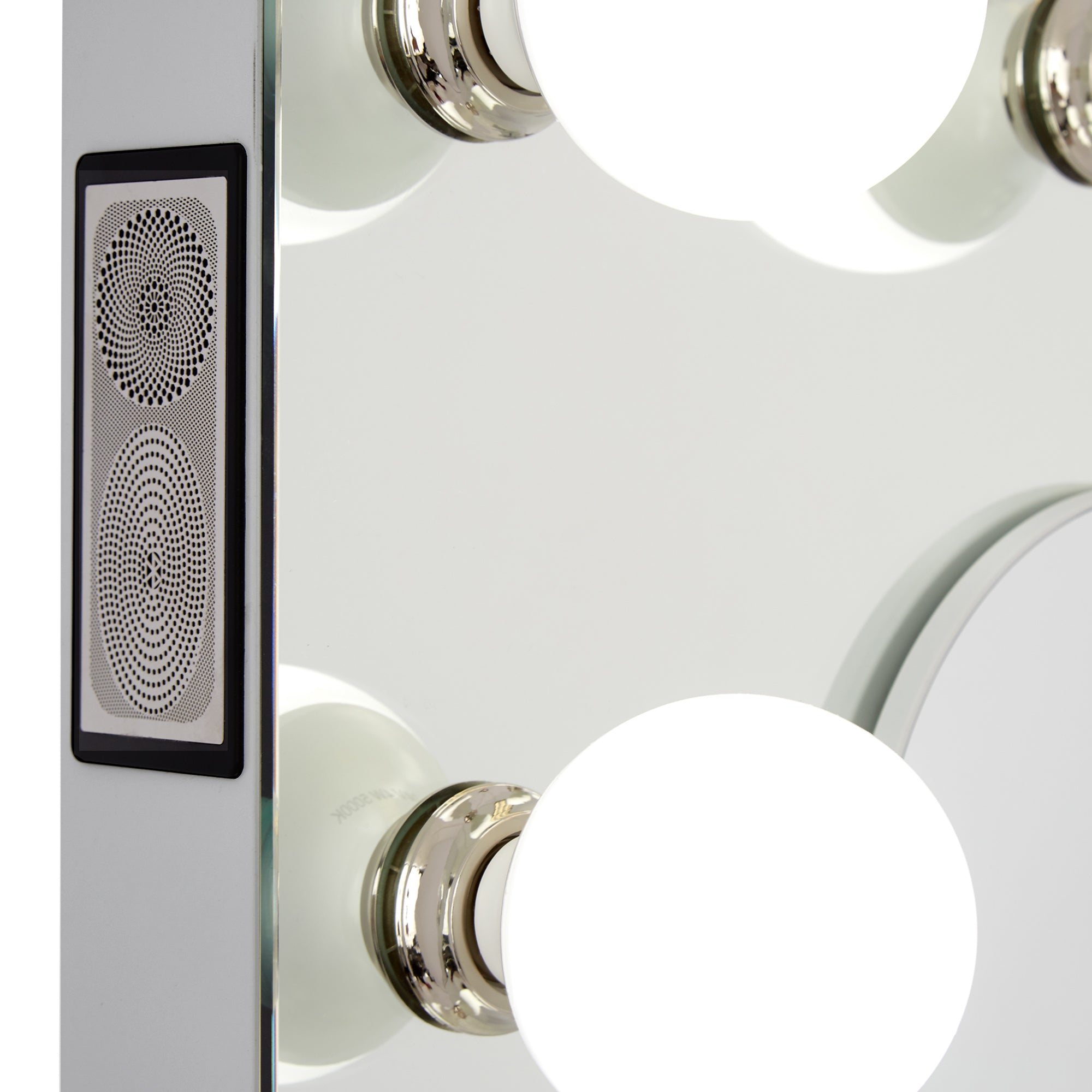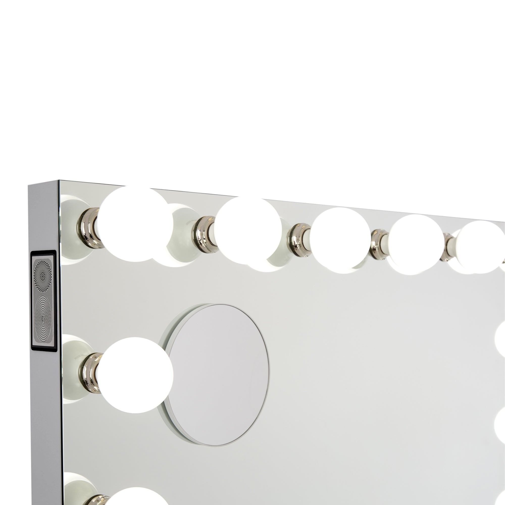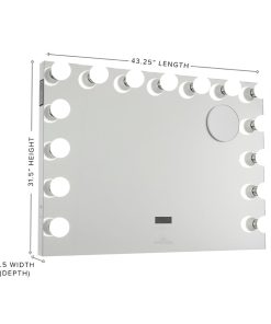 The Impressions Vanity Hollywood Premiere Pro Vanity Mirror is the classic vanity experience— the Hollywood Glam design that provides perfect, even lighting and superior mirror reflection clarity. Featuring 15 light sockets for bright lighting equipped with a dimmer switch and convenient USB and power outlets. The mirror is encased in a robust aluminum body that can easily be wall-mounted with the pre-installed mounting hardware or mount it on a SlayStation with the included base! (3x magnified mirror is not included with Non-Bluetooth option)Bluetooth option: The Hollywood Premiere Pro has the option for wireless Bluetooth speakers with touch-sensitive buttons and backlit LED screen integrated into the mirror for controlling Bluetooth pairing, volume adjustment. It can also let you check the current temperature to make sure you don’t have a makeup meltdown! Bonus 3x magnified magnetic mirror included.Only Impressions Vanity® Hollywood Vanity Mirrors are certified by ETL, CE, and RoHS safety standards.We love seeing your photos! Tag @ImpressionsVanity on Instagram with the hashtag #ImpressionsVanity to submit your photo for a chance feature on our pages!