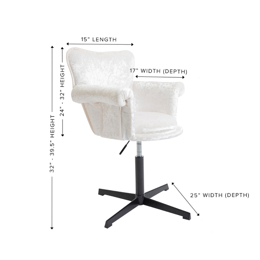 Fit snuggly and comfortably with the Mary vanity chair! This ergonomic chair features cushioned seat, backrest and armrests. This vanity chair swivels 360-degrees and easily adjust the height Available in velvet.Our products are engineered and tested to meet and exceed industry standards in all areas, weight-bearing exercises included. While we do not provide specific weight limits on seating, this chair is designed to support a full-sized adult.