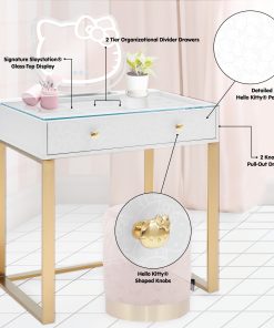 The Hello Kitty® SlayStation Mini Vanity Table features two levels of built-in preset compartments. The top level showcases all your beautiful glam essentials while the bottom level perfectly hides items you don’t want to be displayed. The drawer is also adorned in Hello Kitty signature silhouette that gleams with our supercute Hello Kitty decorative knobs. MDF Material** Assembly required**Wipe clean with soft damp cloth. Avoid using harsh chemicals on printed surface**
