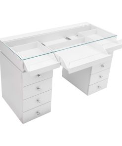 Get ready to create, play, and slay all day with our Hello Kitty® SlayStation® Vanity Table! This table was designed with love and that signature supercute charm we all know and adore. This vanity table is a dream come true for beauty lovers, and Hello Kitty fans everywhere!The SlayStation features an edge-to-edge clear glass top for you to display your vanity accessories and makeup. The top of the vanity includes 3 drawers with front glass panels. The side features 4 spacious drawers that are adorned with our special Hello Kitty knobs.**Wipe clean with soft damp cloth. Avoid using harsh chemicals on printed surface**