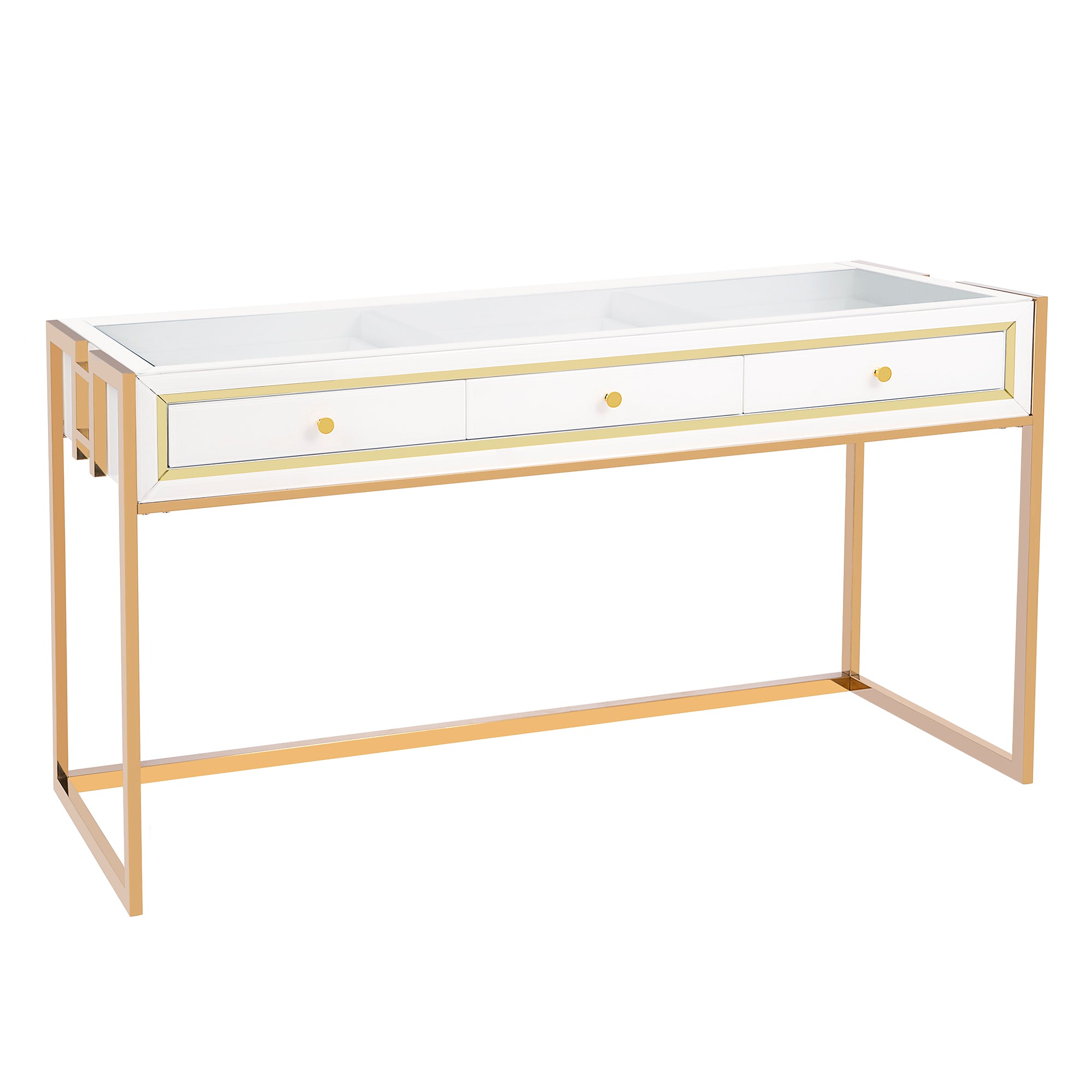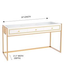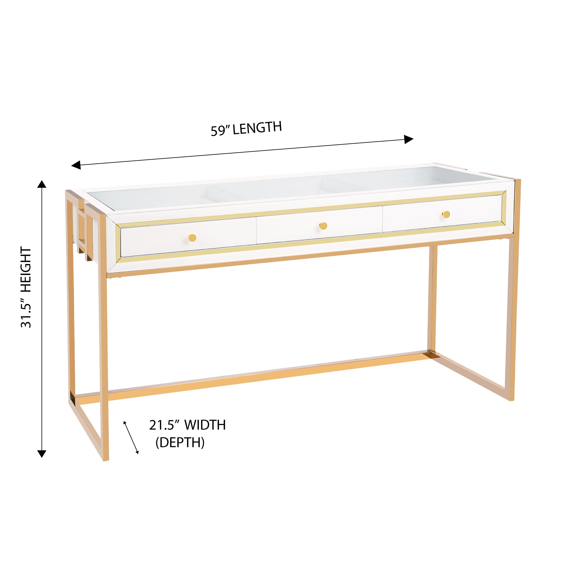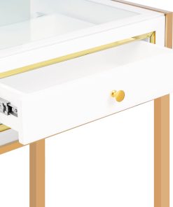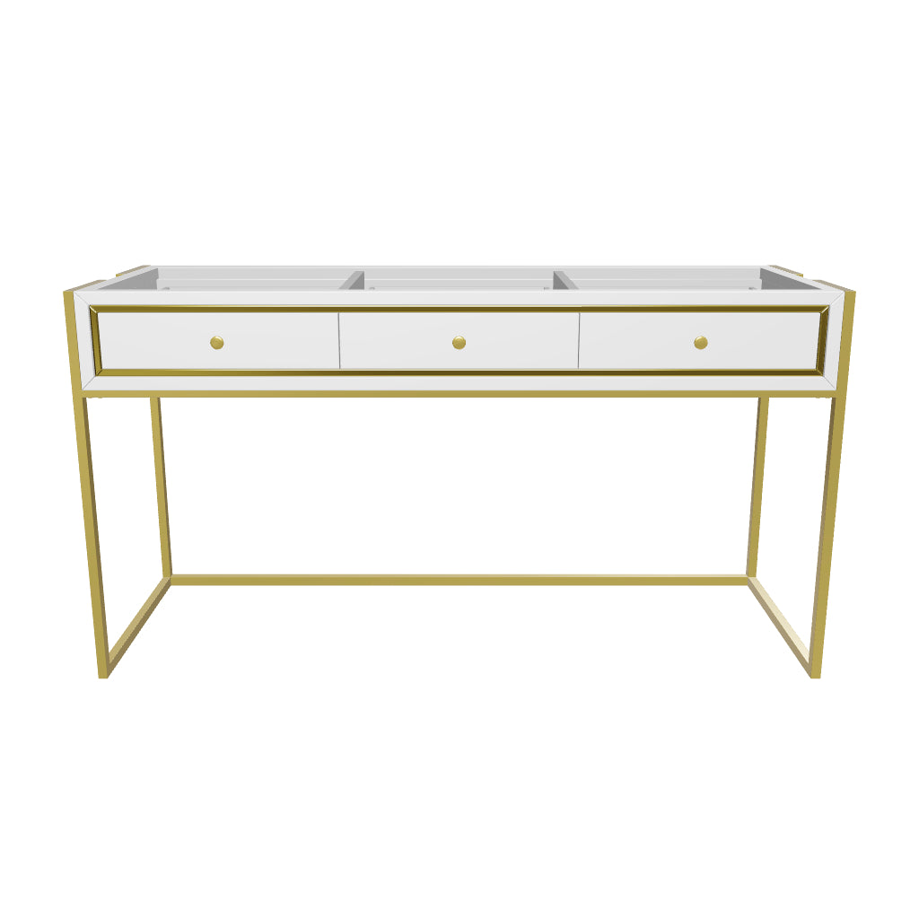 There is nothing more luxe than pure white and gold that is accented with a brilliant design! The SlayStation® Addison table embodies an elegant design that can find any vanity setup. The SlayStation features a clear glass top for you to display your vanity accessories and makeup! This table features three soft-closing drawers that gleam with our beautiful Golden drawer knobs. All three drawers are equally sized. This table comes with our modern designed brilliant golden legs.