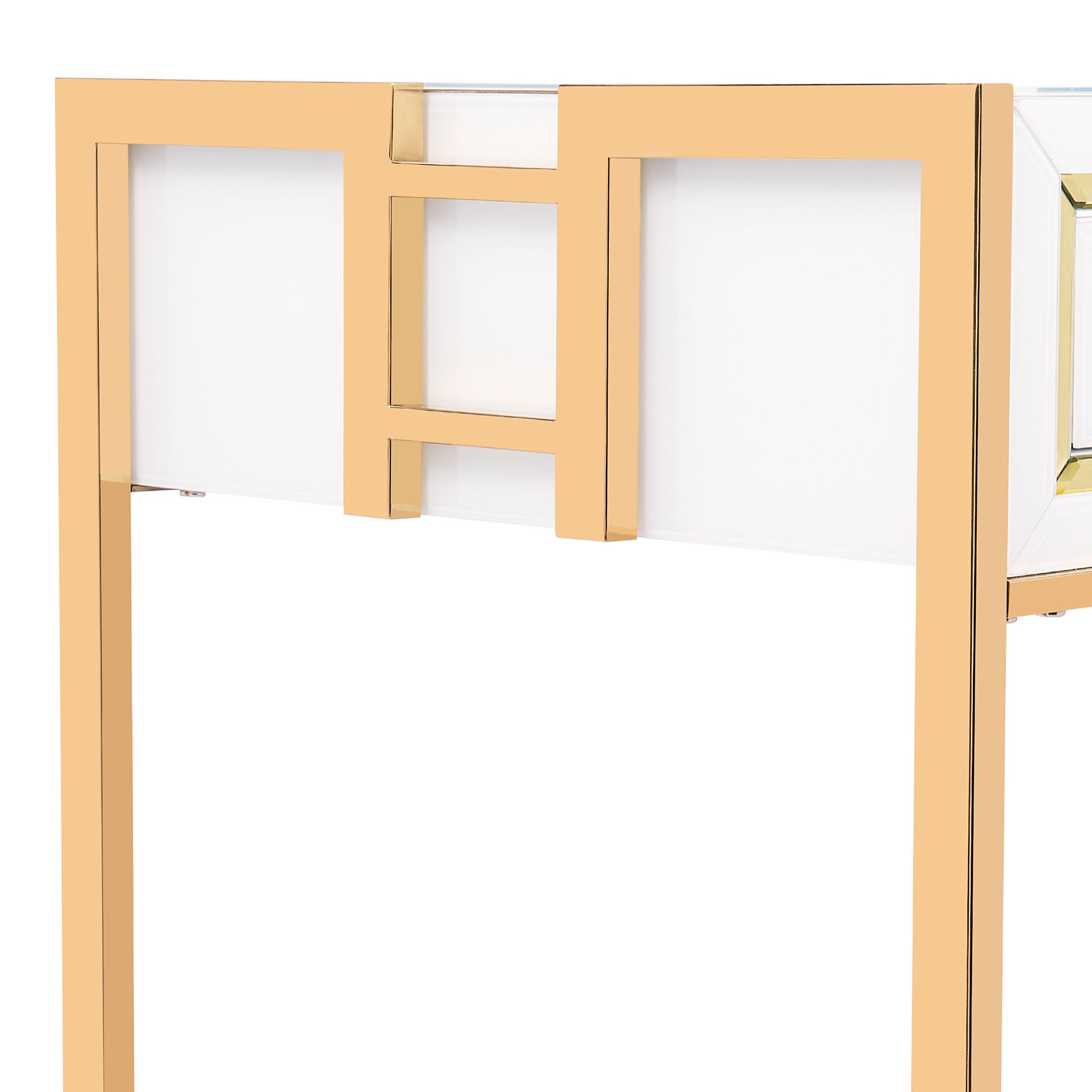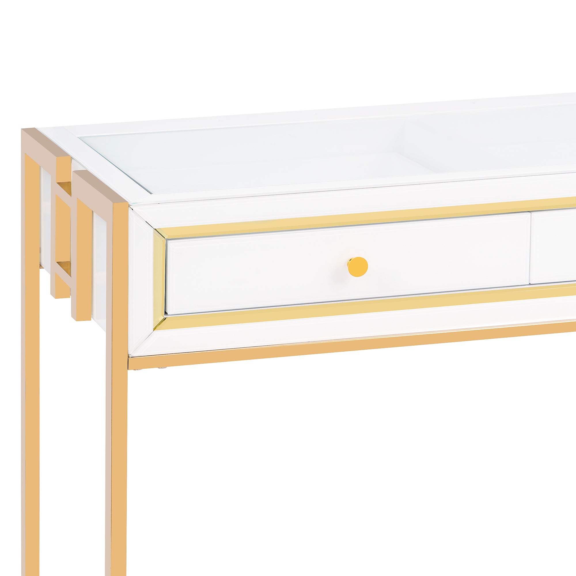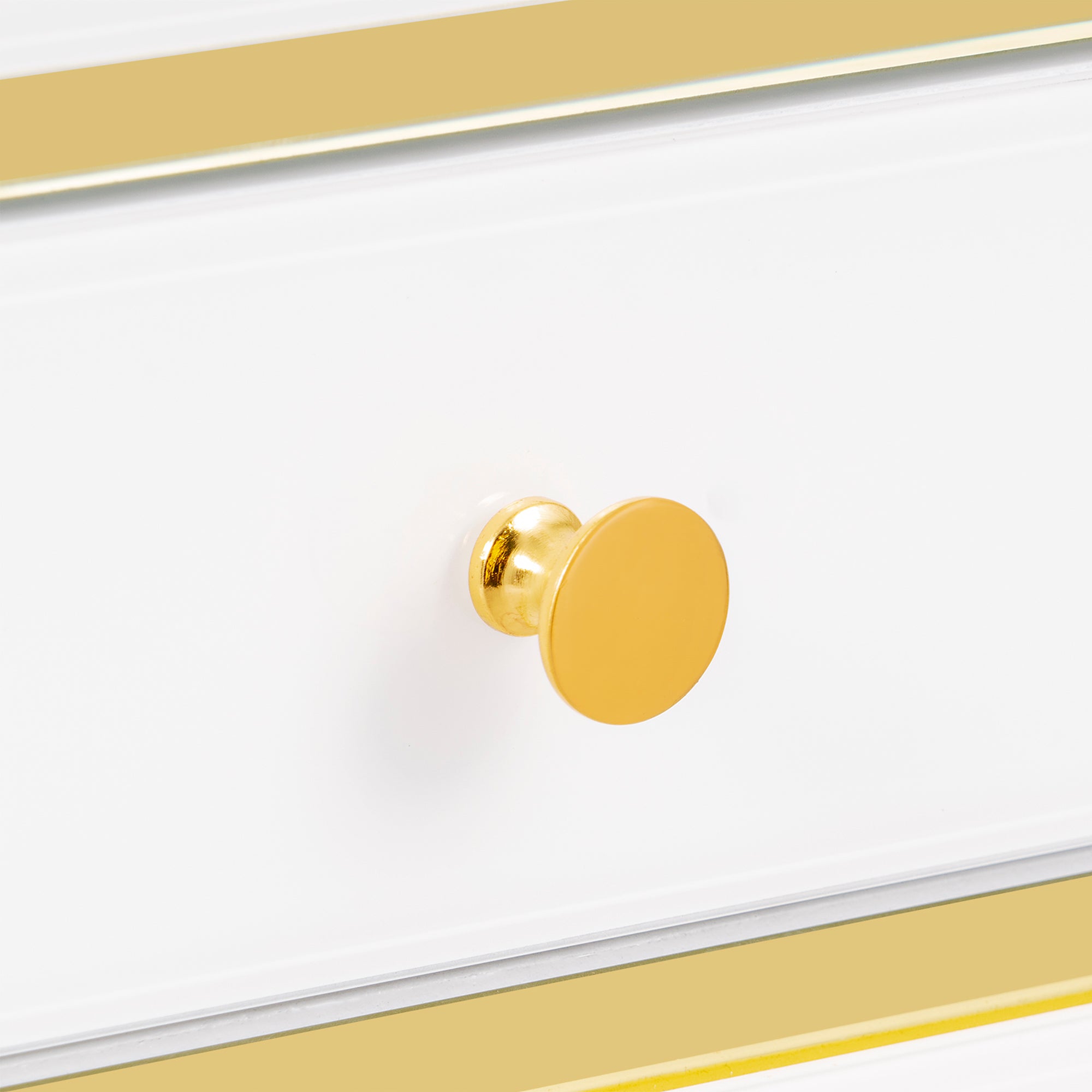 There is nothing more luxe than pure white and gold that is accented with a brilliant design! The SlayStation® Addison table embodies an elegant design that can find any vanity setup. The SlayStation features a clear glass top for you to display your vanity accessories and makeup! This table features three soft-closing drawers that gleam with our beautiful Golden drawer knobs. All three drawers are equally sized. This table comes with our modern designed brilliant golden legs.