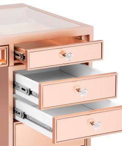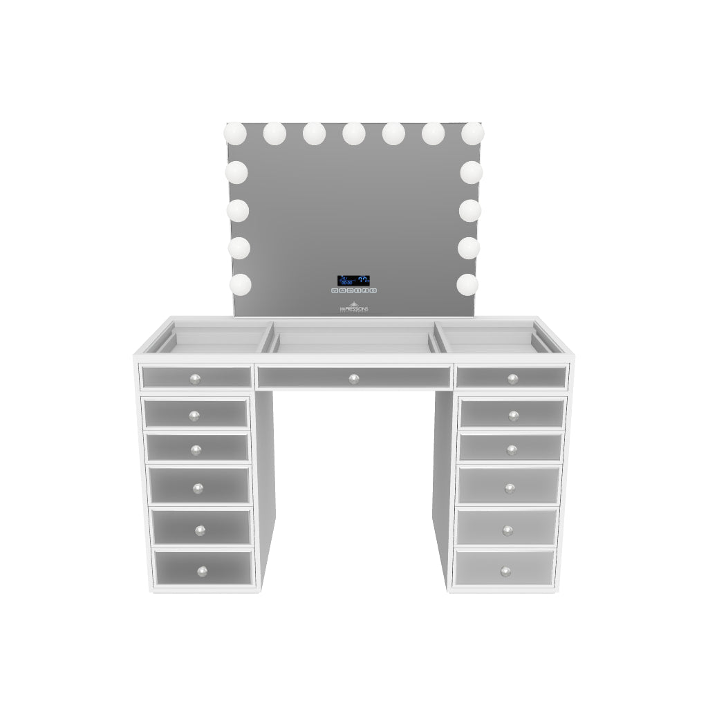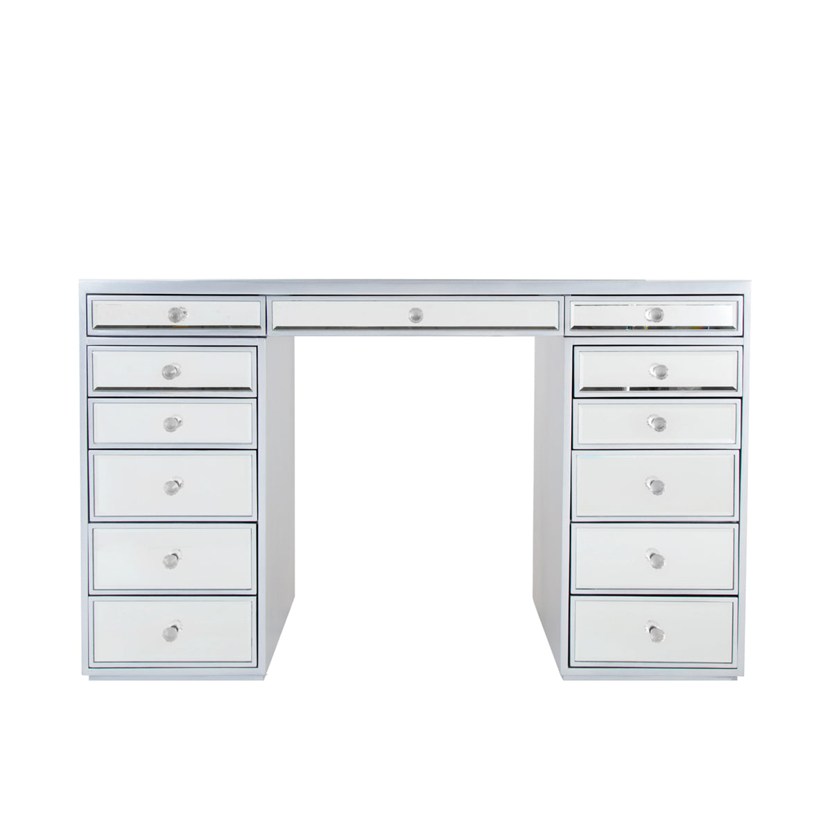 Our flagship SlayStation@ Premium Mirrored Vanity Table inspires awe with a harmonious balance of understated elegance and grandiose presence. Featuring all-mirrored facades and luxurious light-catching crystal knobs, the SlayStation@ is a mirrored perfection that not only compliments but shines just a bright as any Impressions Vanity mirror centerpiece adorned atop. Comes fully assembled.Patent Pending*This product requires Residential Curbside Delivery within the contiguous United States**Freight orders(Curbside Delivery) being delivered to states under COVID-19 safer at home policy, may be delayed. Thank you for your patience.