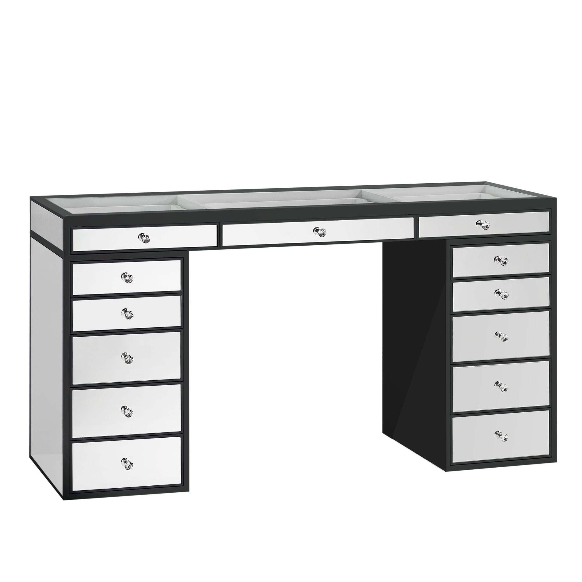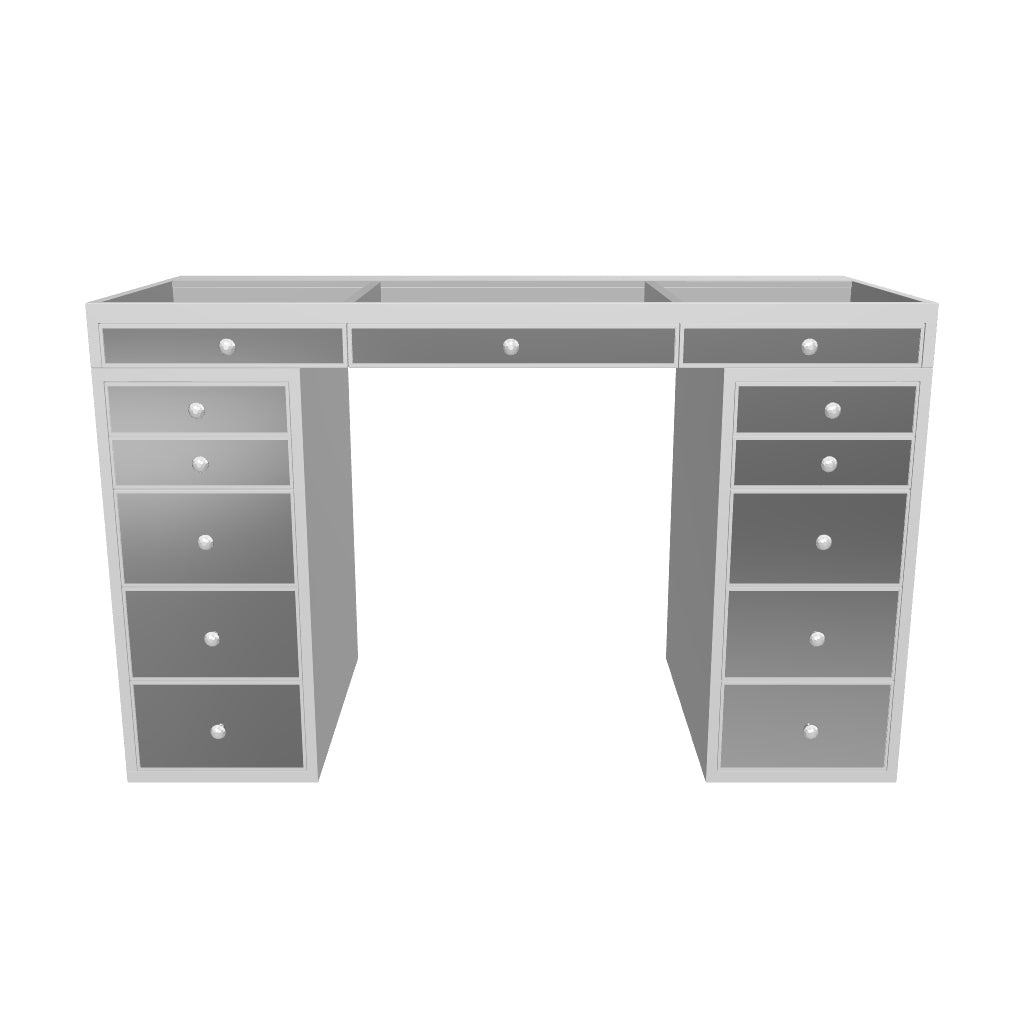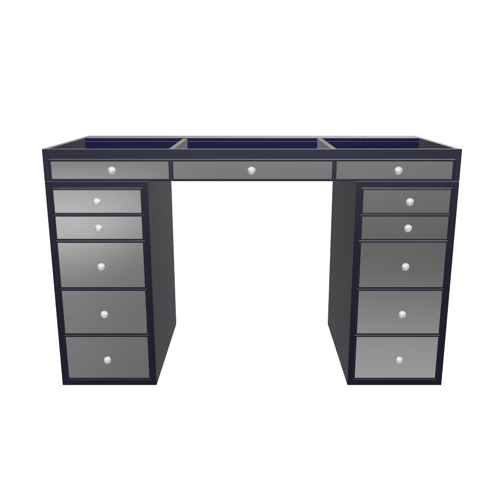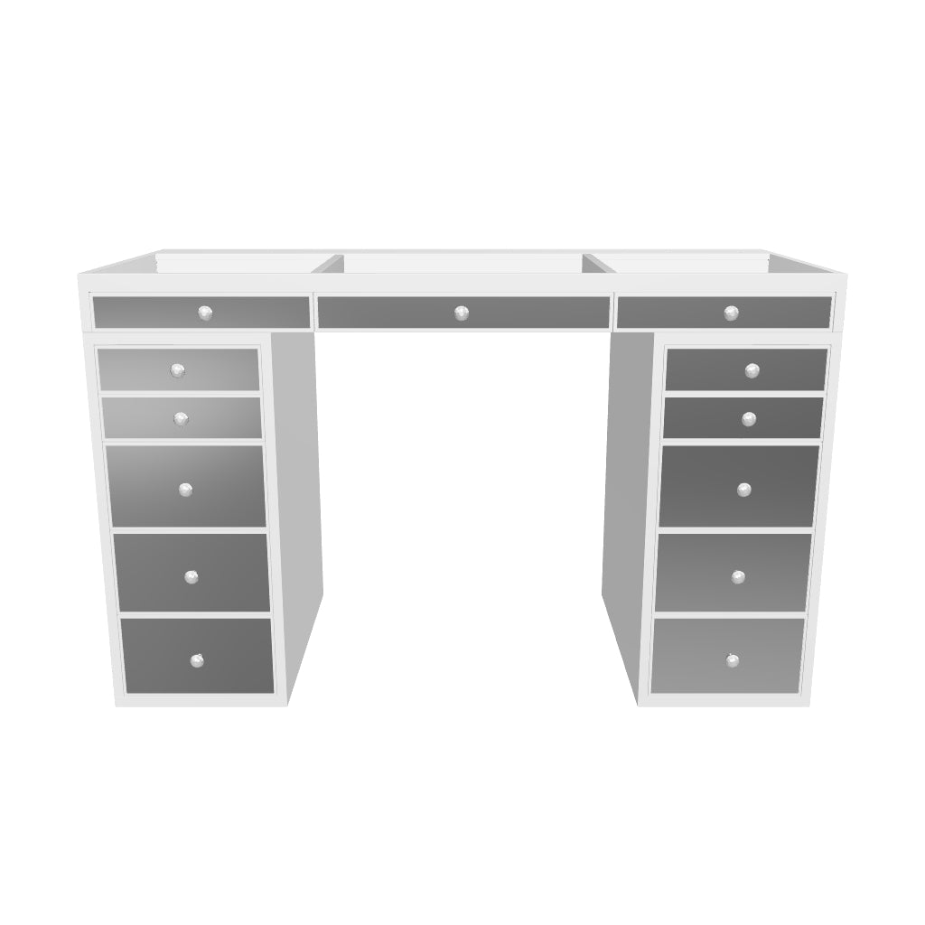 Our flagship SlayStation® Pro Premium Mirrored Vanity Table inspires awe with a harmonious balance of understated elegance and grandiose presence. This SlayStation features all-mirrored facades, mirrored drawers with our luxurious light-catching Crystal Lux Drawer Knobs.The tabletop features a clear glass top and 3 drawers for you to showcase your best vanity accessories!