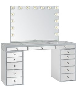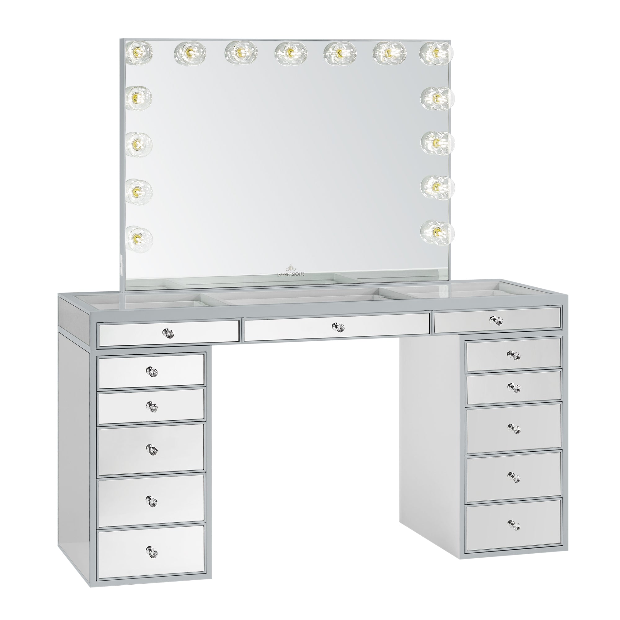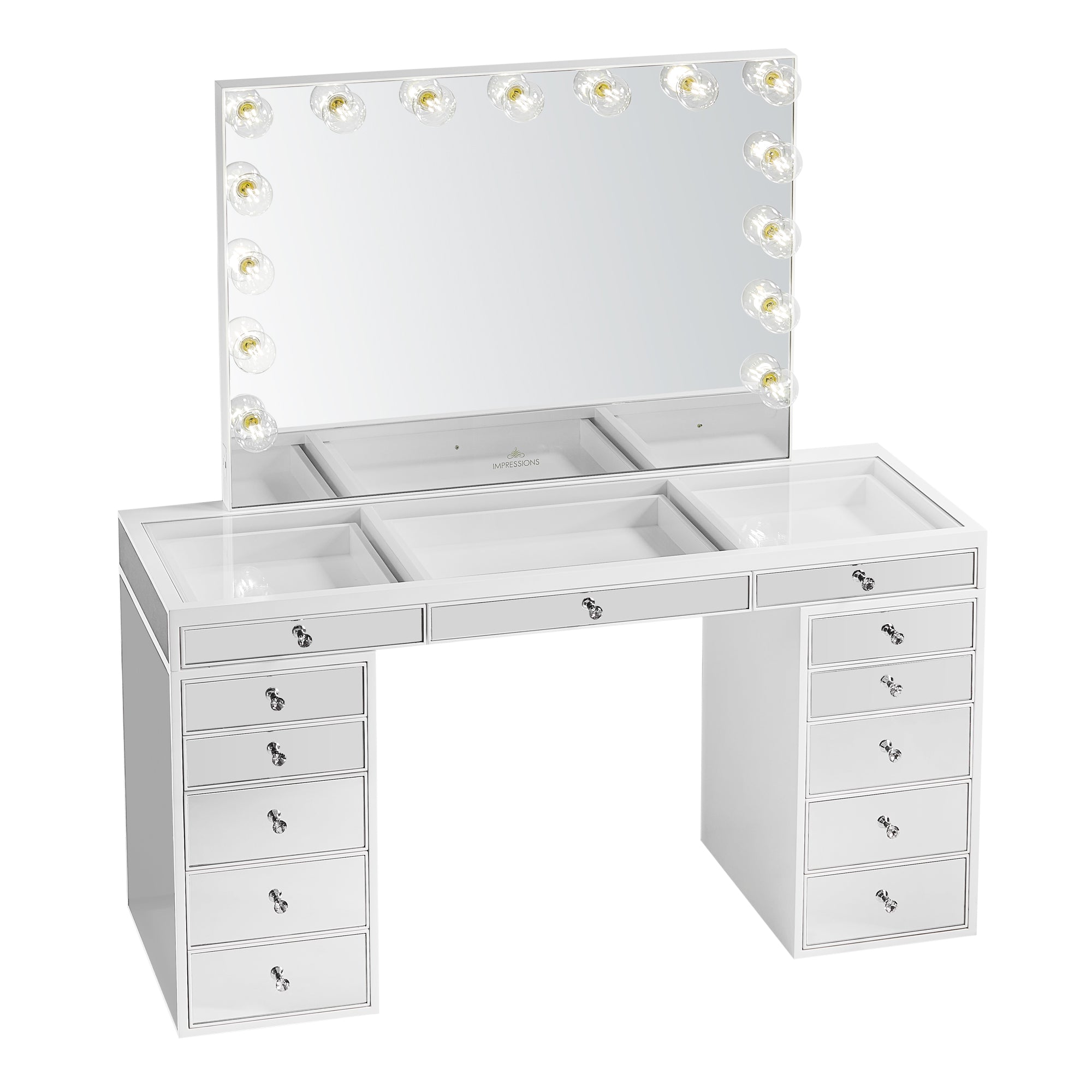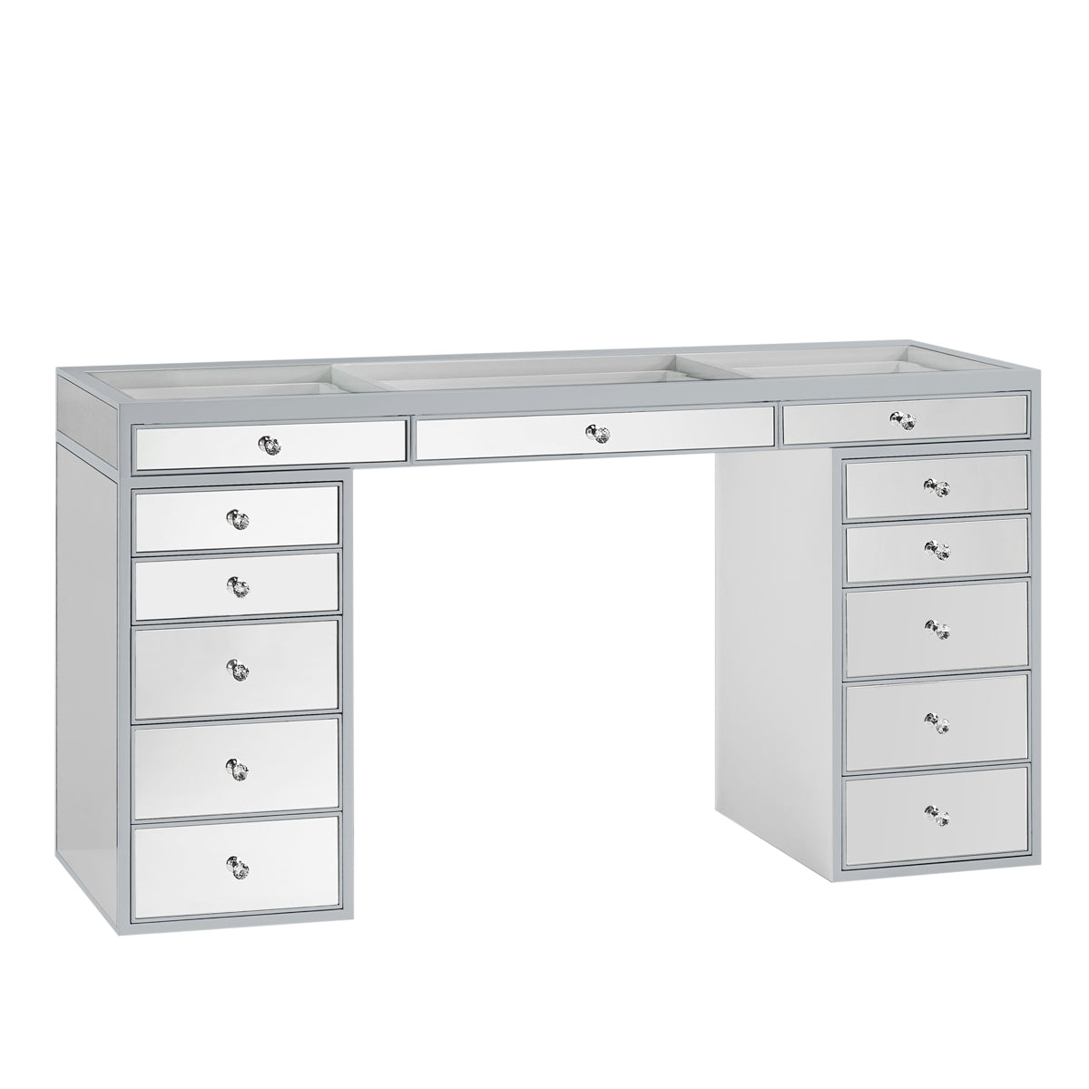 Our flagship SlayStation® Pro Premium Mirrored Vanity Table inspires awe with a harmonious balance of understated elegance and grandiose presence. This SlayStation features all-mirrored facades, mirrored drawers with our luxurious light-catching Crystal Lux Drawer Knobs.The tabletop features a clear glass top and 3 drawers for you to showcase your best vanity accessories!
