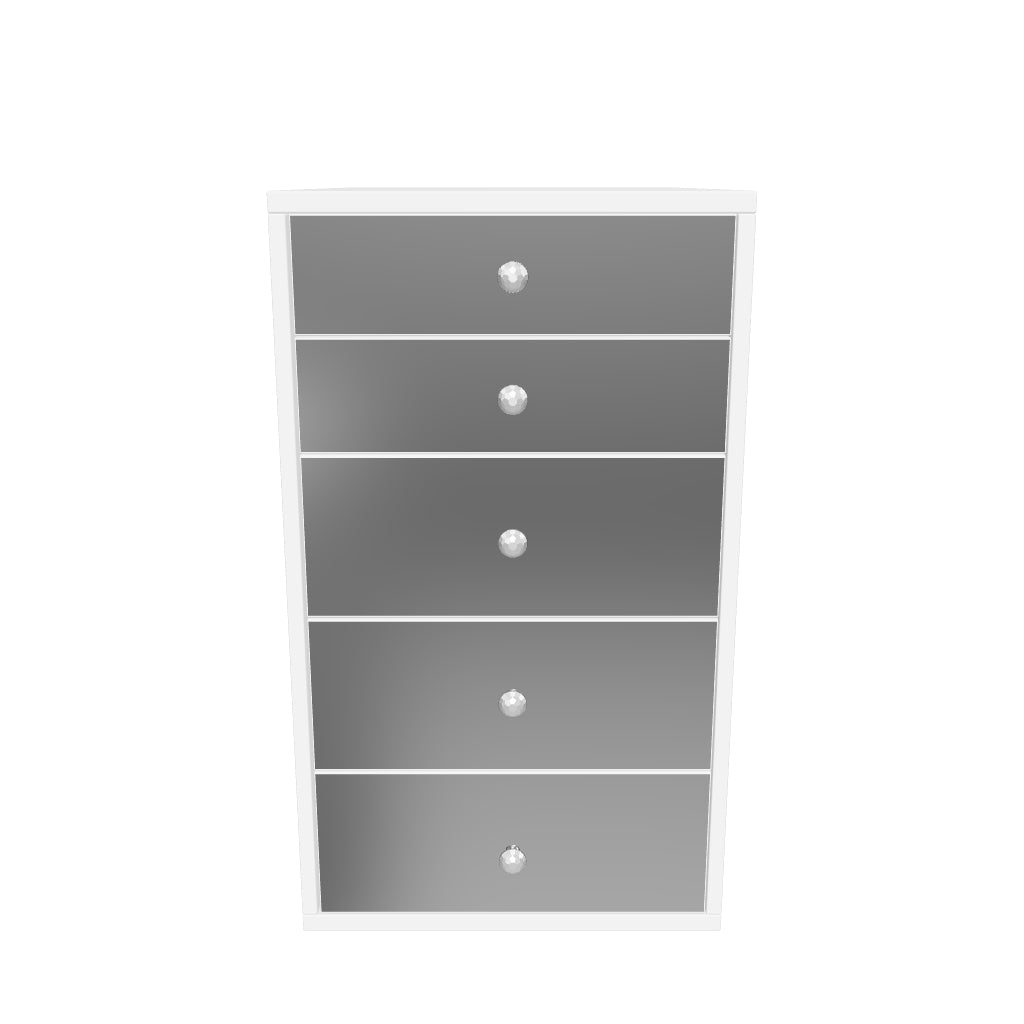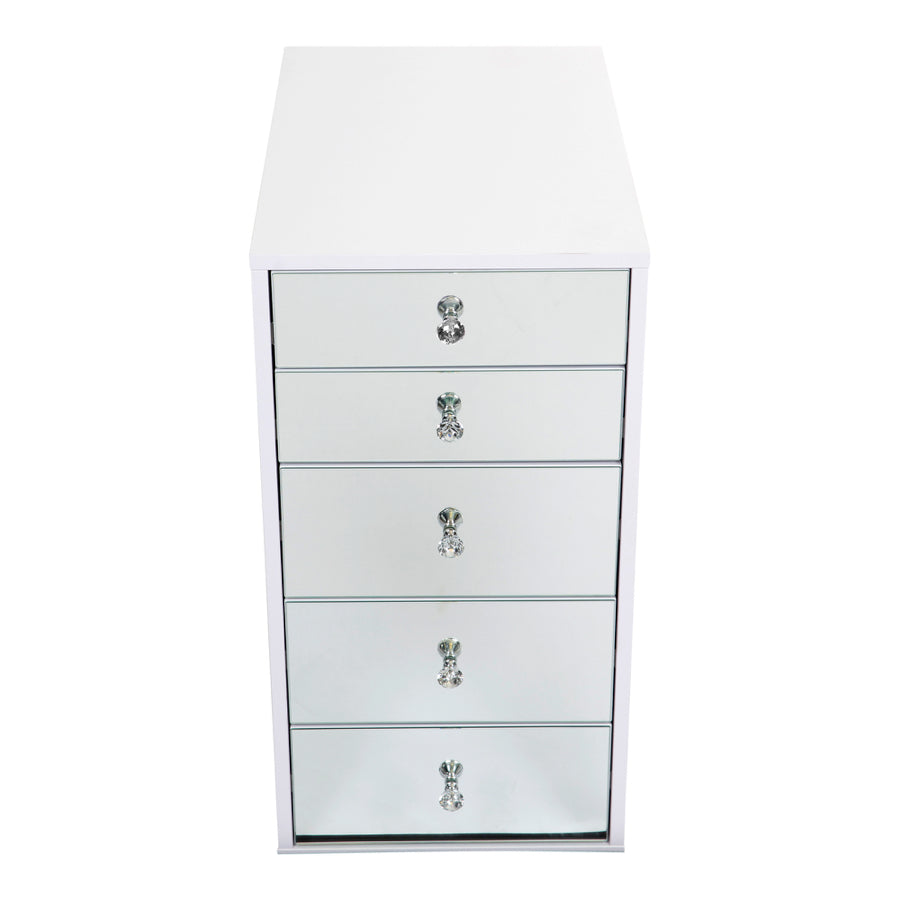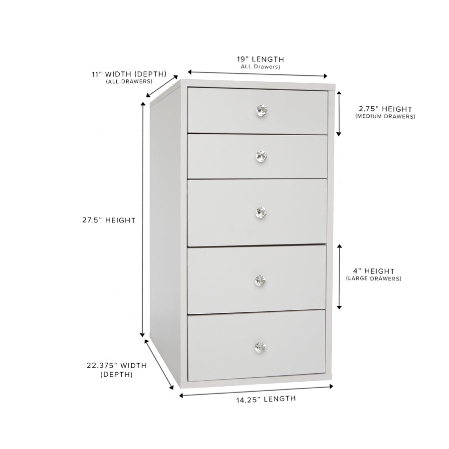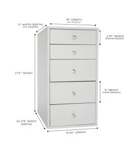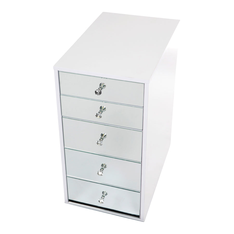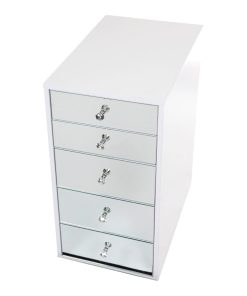 The sleekest drawers you’ll ever see, the SlayStation Mirrored 5-drawer! Featuring its striking mirrored front panels and highlighted with Impression Vanity’s Crystal Lux Knobs. This drawer is equipped with soft close drawers.